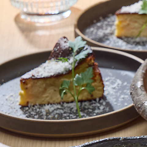 お食事の後は、心ほどける甘い余韻を。厳選されたチーズを使用し、低温でじっくり焼き上げた濃厚な味わいは、コーヒーはもちろん、ワインやウイスキーとも相性抜群です。地下の隠れ家で、職人がこだわる「大人のためのデザート」と共に、夜が更けるのを忘れるような贅沢なひとときをお過ごしください。