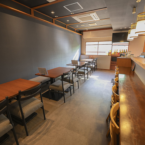 お一人様から少人数まで気軽に過ごせるスッキリとした落ち着いた店内空間♪テーブル席は柔らかな照明と紺基調の配色でまとめ、静かに会話を楽しみたい方にぴったり◎リラックスできる雰囲気を重視しているため、日常使いや仕事帰りにも最適な時間が過ごせます。住宅街にあるのでご家族でのご来店も大歓迎です◎