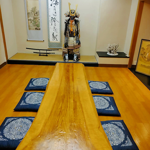 鎧が飾られた特別感のある10名様個室は、落ち着いた座敷空間でゆったりと過ごせるのが魅力。周囲を気にせず会話を楽しめるため、接待や顔合わせ、大切な日の食事にも最適。非日常を感じられる空間演出で、普段とはひと味違う特別な時間を演出してくれる一室です。