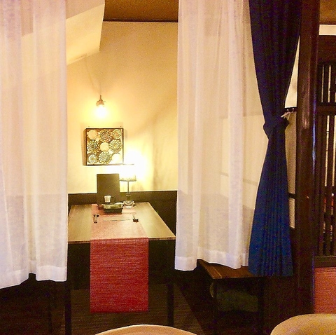 【お食事デート】北欧風カーテンで仕切る個室。5名様までご利用可能です。スローテンポな音楽と共にゆっくり贅沢な会食をお楽しみ下さい。※個室利用でのご予約も承ります。お電話にてお問い合わせください。