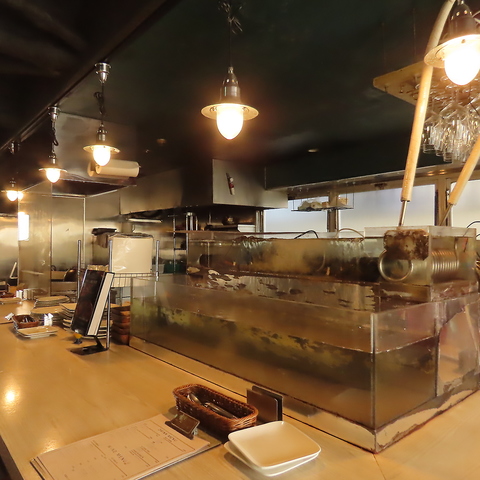 目の前の水槽で泳ぐオマール海老を眺められるカウンター席。ライブ感溢れる内観はデートにもぴったりです