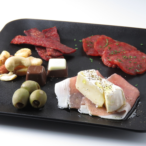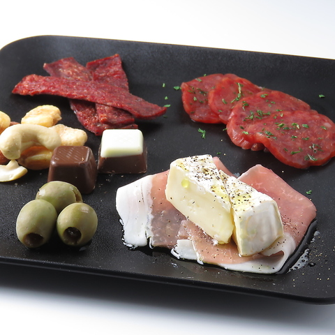 (生ハムとカマンベール、サラミ、ジャーキー、オリーブ、ミックスナッツ、チョコ)