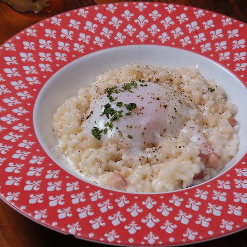 とろ~りクリーミーなコクがたまらない、当店の「カルボナーラリゾット」。仕上げにふりかけるトリュフの香りが、テーブルに届いた瞬間パッと広がります☆濃厚で優しい味わいは、お子さまも大好きな一皿。大人はワインと一緒にリッチな気分で♪ご家族みんなが笑顔になれる、幸せの創作リゾットです!