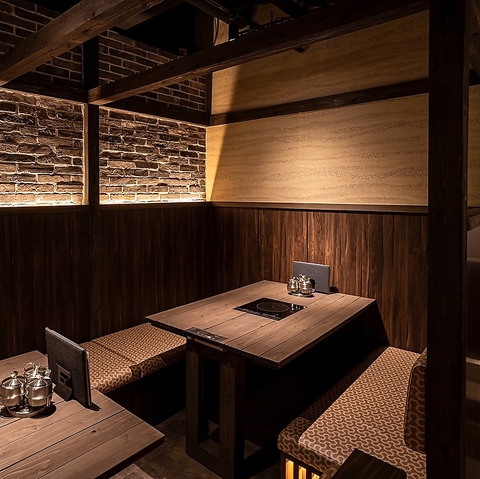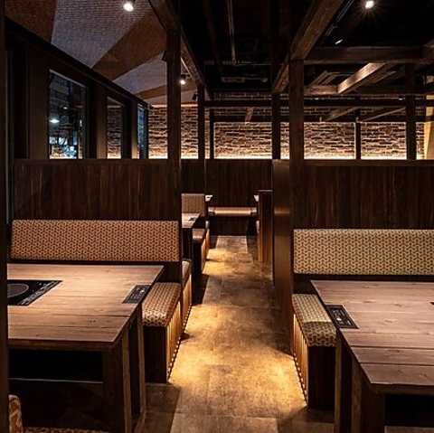 【オープンソファ席:2名×1卓】リラックスして過ごせる2名様用のオープンソファ席。柔らかいクッションと落ち着いた照明が、心地よい親密な空気を生み出します。デートや美味しいお肉をゆっくり味わいたい夜にふさわしい、特別感のあるお席です。こだわりの空間で至福の時を。心地よいソファで、極上のラム肉を堪能♪