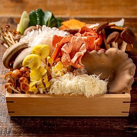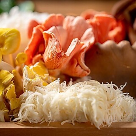 【身体に嬉しい!珍しいきのこをご用意】数十種類の希少なきのこは、自家製薬膳スープと相性抜群。内側から整うような、身体に優しい美味しさが魅力です。その日の気分や体調に合わせてお好みのきのこを選び、心ゆくまで「食べるエステ」をご堪能ください。