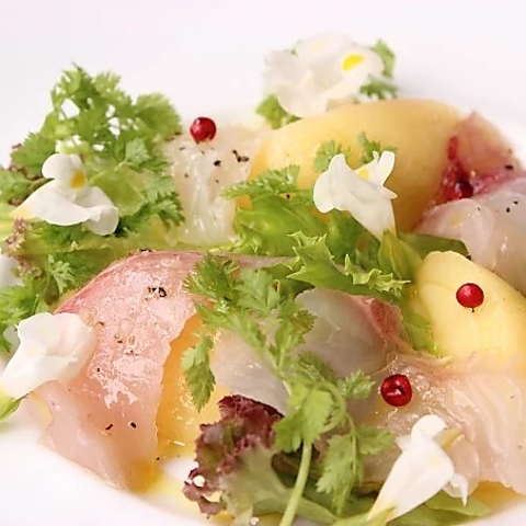 市場直送の新鮮な鮮魚のカルパッチョ盛り合わせ。サラダ仕立てで。