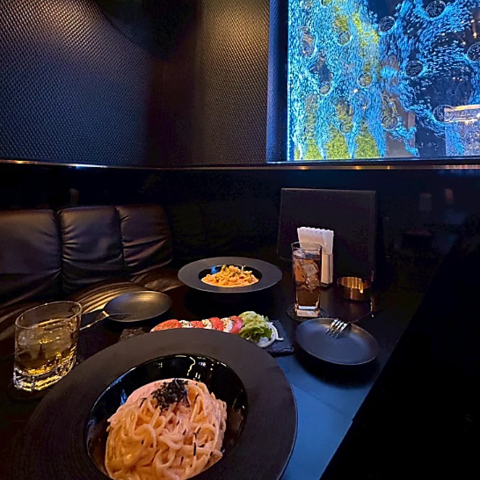 きらびやかなアクアリウムが揺らめき、壁面には鮮やかな緑が広がる。店名の通り「水と森」をテーマにした店内は、都会の喧騒を忘れさせる神秘的な空気に満ちています。シックな色調でまとめられたインテリアが、大人のラグジュアリーな夜を演出。日常を離れ、幻想的な世界観の中でゆっくりとお酒やお食事をご堪能ください。