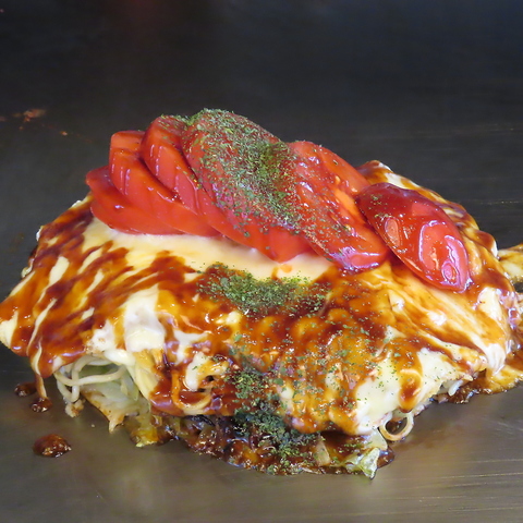 丸ごと1個のジューシーなトマトを堂々とトッピング。お好み焼きの生地とソースの濃厚な旨みとトマトの爽やかな酸味がバランスを生み、見た目も鮮やかで楽しい演出。味が調和する工夫を凝らした一枚をご堪能ください◎