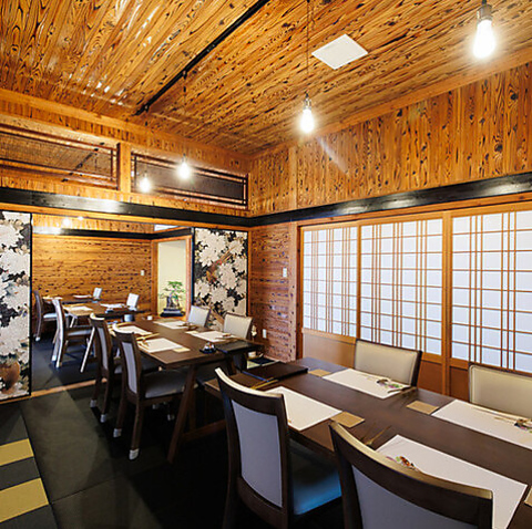 古民家をリノベーションし、シンプルながらも木の温かみをふんだんに活かした内装に仕上げました。まるで「大人の隠れ家」のような落ち着きとモダンさを兼ね備え、ゆったりと寛げる空間を実現しています。特別な記念日やデート、大切な方をもてなす席など、さまざまなシーンにご利用いただけます。