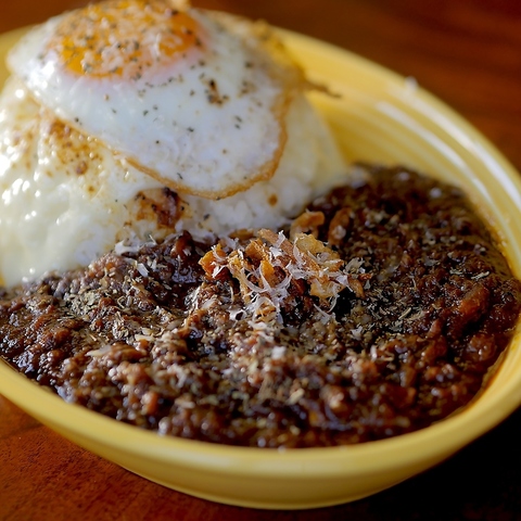 数時間かけて煮込んだ野菜とレモンの皮が入ったキーマカレー。スパイシーさと爽やかさが両立した一品。仕上げに削りたてパルメザンチーズをトッピング