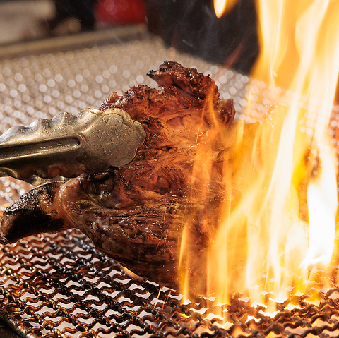 【臨場感溢れるオープンキッチン】客席から調理の様子を間近に眺めることができるオープンキッチンを採用しております。職人が豪快に炎を上げながら「種鶏もも肉炙り焼き」を焼き上げるライブ感は圧巻!