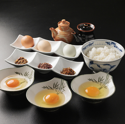 贅沢に種類の異なる「卵」の食べくだべ定食です。3種の薬味と濃口醤油、だし醤油でお楽しみください
