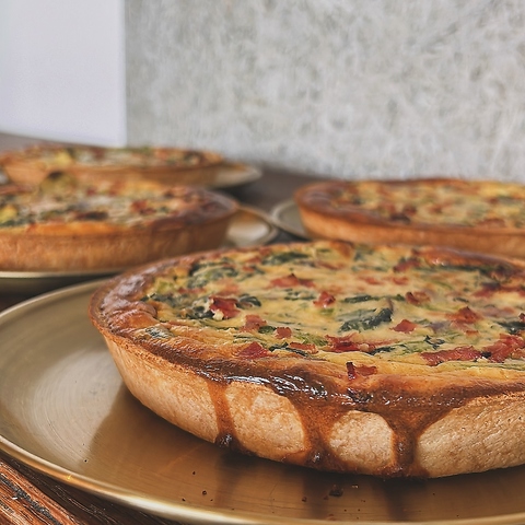「王様プレートランチ」の前菜、さつまいもとベーコンのキッシュをご紹介します!サクサクの生地に、甘み溢れるさつまいもと旨味たっぷりのベーコンを詰め込み、香ばしく焼き上げました。彩り豊かな見た目は、女子会や自分へのご褒美ランチにもぴったりです◎仕入れ状況によって内容が変わります。お熱いうちにお召し上がりください♪