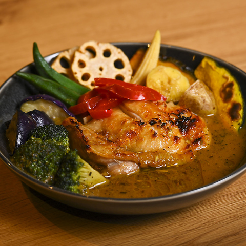 運ばれてきた瞬間、パッと華やかな彩りに心が弾む一皿!ブロッコリーやホクホクのかぼちゃ、シャキシャキのレンコンやオクラなど、器いっぱいに盛り付けられた大ぶり野菜はボリューム満点です。たっぷり入ったキノコ類から出る旨みが、スパイシーなスープと絶妙にマッチ。野菜本来の甘みを存分に味わえる大満足のカレーです♪