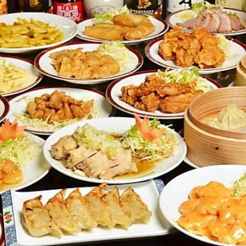 【前菜】ザーサイ キムチ ピータン ピータン豆腐 木耳と胡瓜和え 焼豚 蒸し鶏 くらげの酢の物 【揚げ物】 海老せんべい ポテト 軟骨 春巻 スパイシーカレー味若鶏の唐揚げ 豚の天ぷら いかの天ぷら 肉団子の天ぷら 小海老の天ぷら 【一品料理】 酢豚 海鮮八宝菜 木耳と玉子と豚肉炒め キャベツと豚肉炒め 焼肉炒め 麻婆豆腐 野菜炒め 麻婆春雨 豚とピーマン炒め 京味噌肉炒め かに玉 油淋鶏 レモン鶏 棒々鶏 エビチリ 等