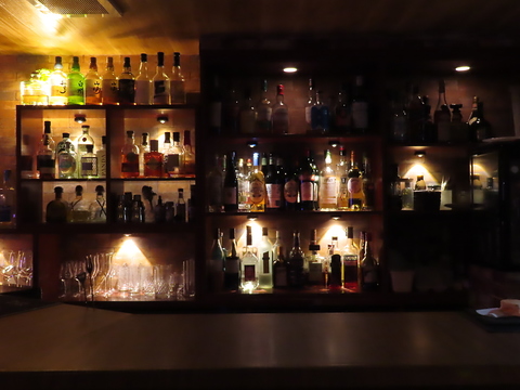 バックバーにズラリと並んだボトルが、美しい大人の空間を演出するカウンター席。間接照明の優しい光が、グラスのお酒をより一層美味しそうに照らし出します。お酒を飲む空間そのものにもこだわりたい、そんなお客様に満足していただけるよう、細部まで丁寧に作り込まれた店内です 。