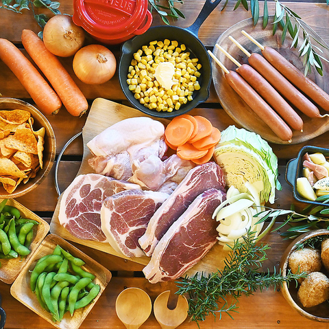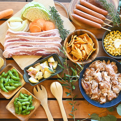 厚切りの豚バラやタッカルビ、ジャーマンポテトやフランクフルトなどお肉を中心にカジュアルに楽しめるコースです。コンロや割り箸・紙皿などはセットに含まれているので手ぶらでOK!!ソフトドリンク飲み放題orアルコール&ソフトドリンク飲み放題をお選びいただけます。予約・詳細はコースページをご覧ください。