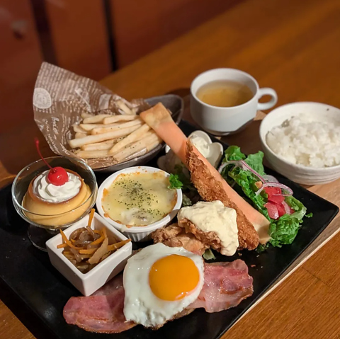 パンケーキだけでなく、満足感のある単品メニューも豊富にご用意。人気のピザやポテトなど、シェアしやすいアラカルトに加え、国産鶏を使用した唐揚げやチキン南蛮等、ごはんが進む一皿や、タコライスや和風ロコモコ丼にはスープが付き、ランチ利用にも最適。お一人様からグループ迄、シーンに合わせてこだわりの手作り料理をぜひお楽しみ下さい