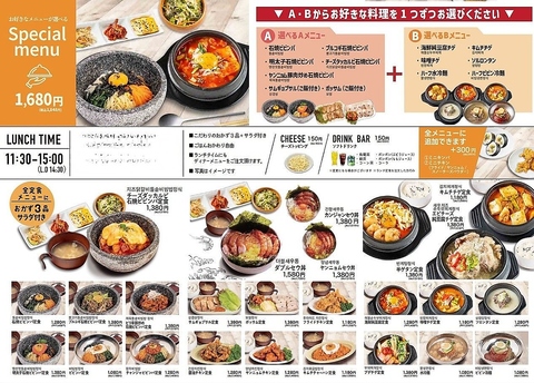 - LUNCH TIME11:30~15:00(L.O 14:30) ■こだわりのおかず3品+サラダ付き ■ごはんおかわり自由 ■ランチタイムにもディナーメニューをご注文頂けます。■写真は一例です■チーズトッピング165円(税込)■全メニューに追加できます+330円(税込)→1、ミニキンパ/2、ミニチキン(フライド/ヤンニョム/スノーチーズパウダー)