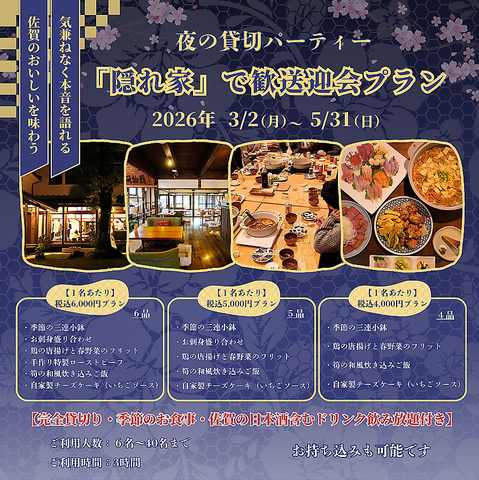 期間:3/2から5/31完全貸切り、季節の料理、佐賀の日本酒を含む飲み放題付きプランになります。【1名あたり】税込4,000円プラン 4品【1名あたり】税込5,000円プラン 5品【1名あたり】税込6,000円プラン 6品※飲み物はセルフになります。